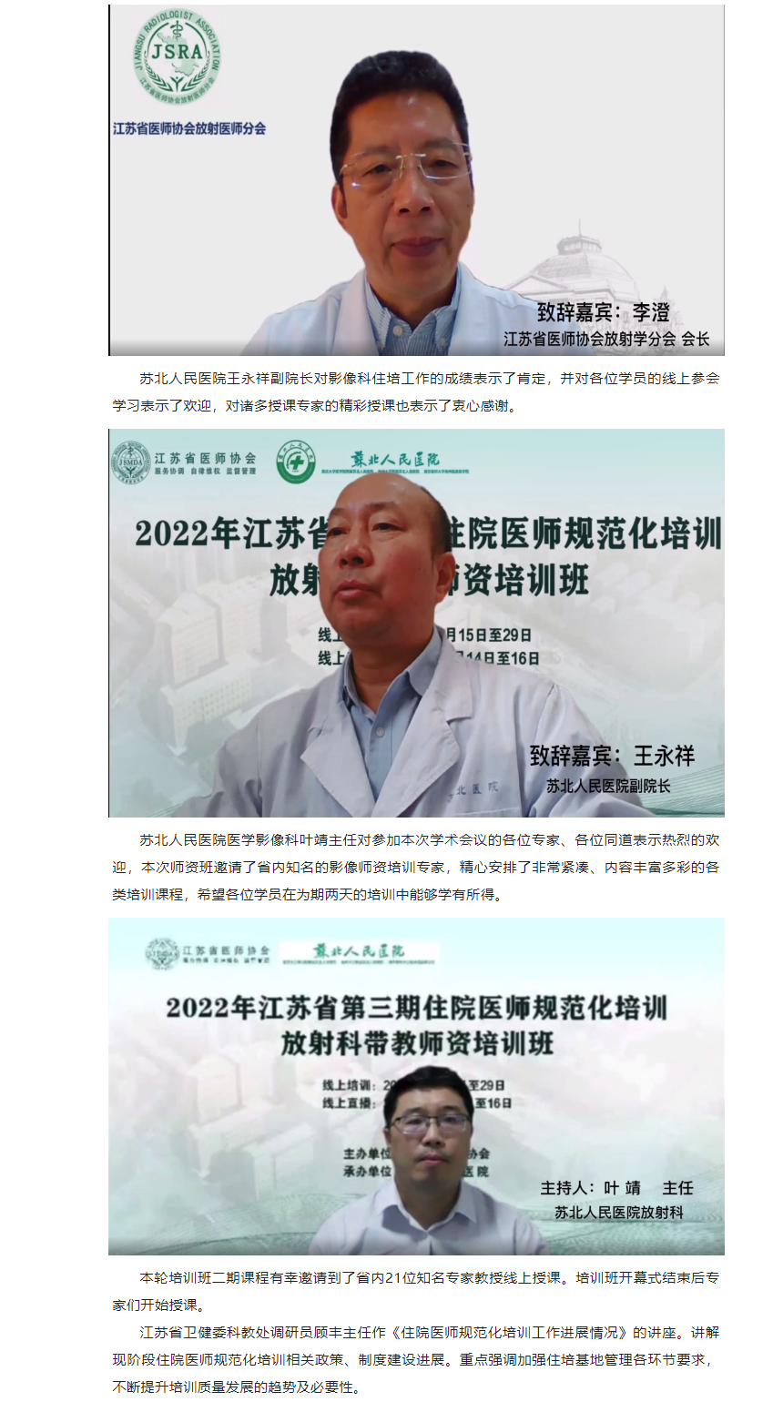 为加强我省住院医师规范化培训师资队伍建设,提高我省住培师资质量,受江苏省卫生健康委科教处委托,由江苏省医师协会主办,苏北人民医院承办的“2022年江苏省第三期住院医师规范化培训放射科带教师资培训班”顺利举办。本次培训班采用线上培训学习的方式开展。来自省内46个国家级住培基地放射科医学专业的住培老师共135人免费参加培训。